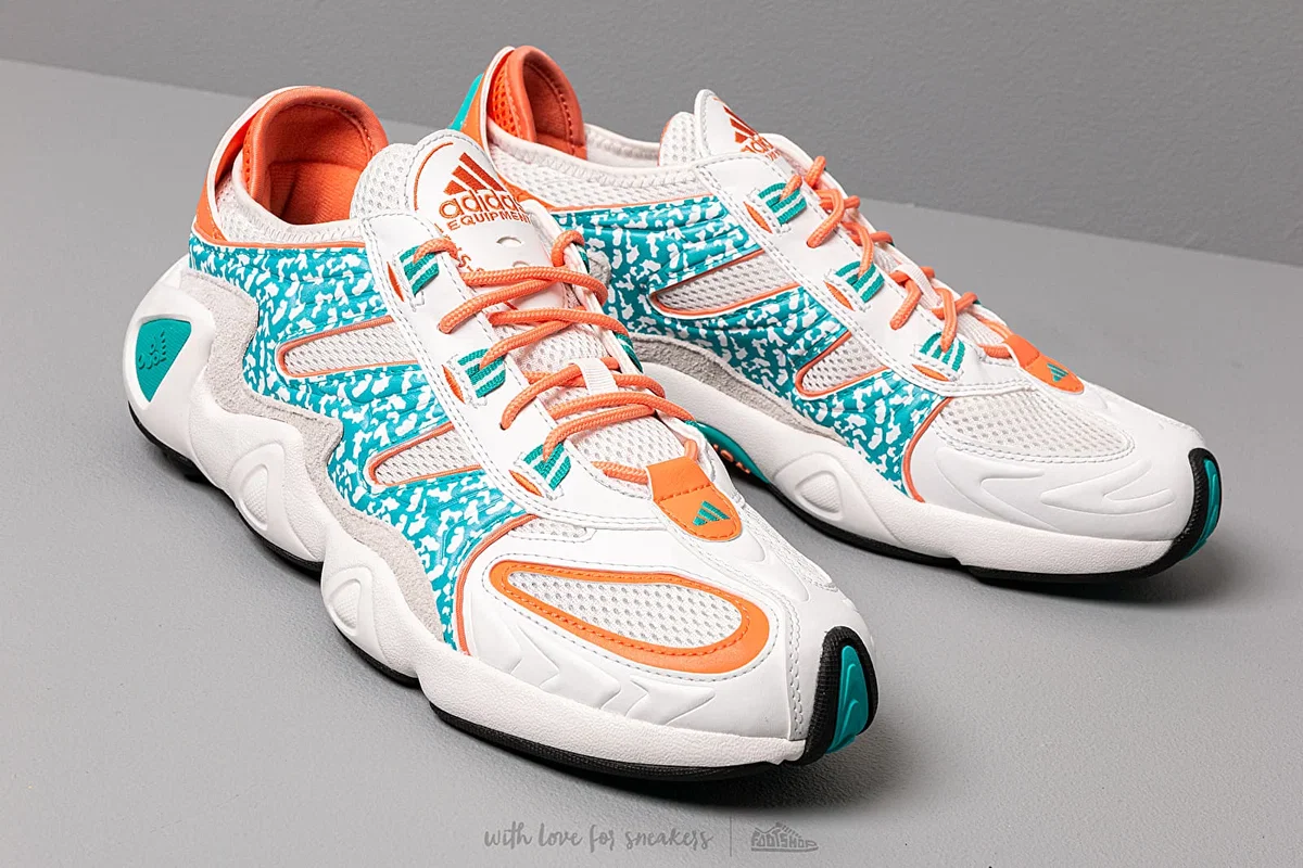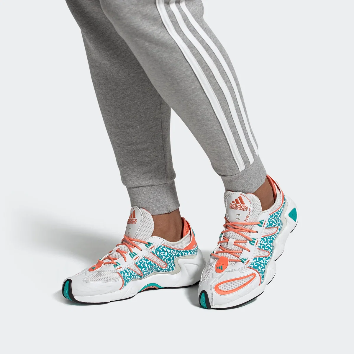 zapatillas adidas FYW S-97 "Coral", un modelo de estilo retro inspirado en el diseño de running de los años 90 (específicamente el Equipment Salvation). Este calzado destaca por su estética voluminosa tipo "chunky sneaker" y el uso de tecnologías clásicas de la marca.